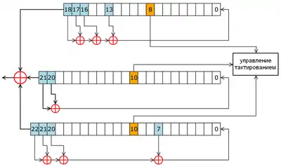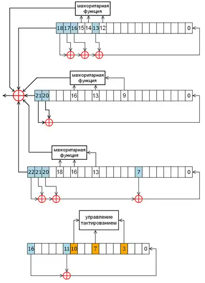 - выходной бит системы — результат операции XOR над старшими битами регистров и мажоритарных функций от определённых битов регистров: