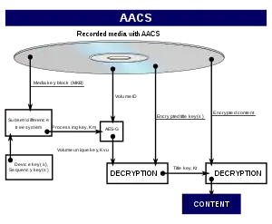 Для просмотра фильма проигрыватель должен сперва расшифровать содержимое диска. На диске содержится 4 элемента — блок ключа носителя (Media Key Block, MKB), идентификатор тома (VolumeID), зашифрованные ключи наименования (Title Keys) и зашифрованное содержимое. MKB зашифрован схемой дерева с вычитанием поднаборов (Subset Difference Tree). В сущности, набор ключей расположен в дереве так, что любой ключ может быть использован для нахождения любого другого ключа, кроме родительских. Таким образом, чтобы аннулировать данный ключ устройства, MKB должен быть зашифрован с помощью своего родительского ключа. Если MKB расшифрован, он предоставляет ключ носителя, или KM (Media Key). KM комбинируется с идентификатором тома (который программа может получить, если присутствует криптографический сертификат, как написано выше) в одной схеме путём шифрования (AES-G), чтобы получить уникальный ключ тома (Kvu). Kvu используется для расшифровывания ключей наименования, которые используется для расшифровывания контента.[4][6]