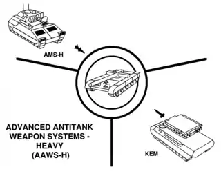Advanced Antitank Weapon System Heavy («тяжёлый противотанковый ракетный комплекс») — программа по разработке комплексов управляемого вооружения танков и противотанковых управляемых реактивных снарядов, а также тяжёлых комплексов, переносимых и обслуживаемых расчётом в 3—4 человека или перевозимых на машинах повышенной проходимости[7]. Сходу разделилась на два самостоятельных конкурирующих направления: разработки вооружений с кинетическим бронебойным поражающим элементом подкалиберного типа и кумулятивных боеприпасов с боевой частью тандемного типа. Здесь сошлись между собой кинетический реактивный управляемый снаряд «Кем» от корпорации «Эл-ти-ви» и авиационный ПТУР «Хеллфайр» от компании «Эмерсон электрик», модифицированный для стрельбы с сухопутных транспортных средств[8]. Кроме предложенных перспективных образцов, компания «Хьюз» представила проект КУВТ «Эй-эм-эс-эйч» (AMS-H), по сути своей являющийся модифицированным «Тоу».[5] Вышеупомянутая «Тексас инструментз» участвовала в разработке всех трёх перечисленных прототипов, работая над системами наведения для них. Под данную программу подогнали вообще любые смежные программы и курируемые армейскими структурами проекты дальнобойных пехотных ракет, которые бы могли использоваться для борьбы с танками и бронетехникой противника, среди прочих в AAWS-H плавно перетекла программа разработки комплекса противовоздушной обороны переднего края (Forward Area Air Defense System, сокр. FAADS).[1] За отсутствием других конкурентов (предусмотрительно не допущенных до участия в конкурсе) победу одержал «Кем», за время конкурса модифицированный до своей новой модели под названием «Лоусат», принятой на вооружение, но не пошедшей в серийное производство из-за бюджетных сокращений, уступив место модифицированному «Тоу», который в итоге остался на вооружении в исходном виде, несмотря на все попытки его замены даже в изменённом виде.