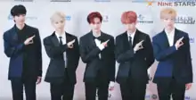 ![]() AB6IX на презентации своего первого мини-альбома в Сеуле Слева направо: Ёнмин (бывший участник), Ун, Дэхви, Уджин и Донхён | |