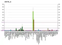 Высокая экспрессия белка — в плаценте. Более низкая — в тонком кишечнике, печени и толстом кишечнике.