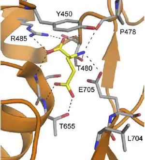 Основным эндогенным лигандом АМРА-рецепторов является глутамат, который связывается с «клешнеподобной» структурой в лиганд-связывающем домене каждой из субъединиц (см. выше), таким образом, рецептор имеет четыре участка связывания глутамата. Открытие ионного канала происходит после связывания агониста с двумя участками, но связывание с большим количеством участков увеличивает проводимость канала и среднее время его пребывания в открытом состоянии. Две карбоксильные и одна аминогруппа глутамата, образуют девять водородных связей с разными остатками аминокислот в лиганд-связывающем домене рецептора (см. Рисунок 3)[62].