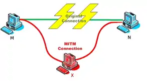 - Во время атаки ARP-spoofing узел X (злоумышленник) отсылает два ARP-ответа (без запроса) — узлу M и узлу N. ARP-ответ узлу M содержит IP-адрес N и MAC-адрес X. ARP-ответ узлу N содержит IP-адрес M и MAC-адрес X.