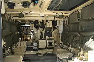 Отделение десанта. По бортам отделения, над откидными сиденьями, заметно размещение противоосколочных подбоев.