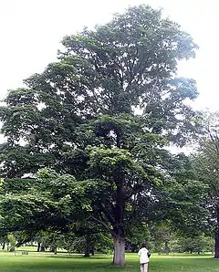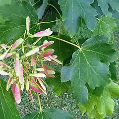 Довольно высокое дерево, высота до 40 метров. Диаметр ствола более 1 метра[5]. У дерева пятипалые листья, типичные для кленов.