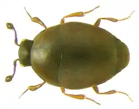 Передние голени чуть расширены, их наружный край с тонкими щетинками. Тело овальной формы.[1]
