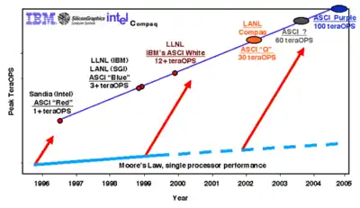 | 1997 | ASCI Red | Сандийские национальные лаборатории | массово-параллельная компьютерная система на базе процессоров Intel Pentium Pro. Первый в истории суперкомпьютер, достигший производительности свыше 1 триллион флопс (1 Тфлопс). После обновления в 1999 году достигнута производительность 3.2 Тфлопс. Списан 29 июня 2006 года[10]. |