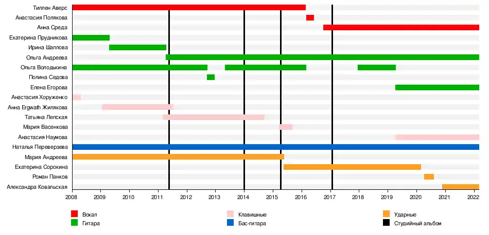 - Ольга Володькина — гитара (2008—2012, 2013—2016, 2017—2019)