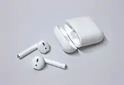 AirPods — беспроводные Bluetooth наушники от корпорации Apple. Представляют собой два раздельных наушника (TWS), использующих жесты для взаимодействия с пользователем: вынимание наушника из уха приостанавливает воспроизведения (функция «пауза»); возврат его на место — продолжит воспроизведение; двойное касание запускает голосового ассистента Siri, либо управляет воспроизведением музыки.[1] Наушники AirPods совместимы с устройствами Apple на iOS 10 или новее, а также с ПК и ноутбуками на базе macOS Sierra и часами на базе watchOS. Наушники воспроизводят звук с любого устройства, совместимого со стандартом Bluetooth 4.0. На устройствах с ОС Android доступен жест «двойное касание» для управления.[2]