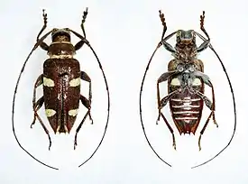 Тело широкое и выпуклое. Лоб умеренно выпуклый. Длина усиков равна длине тела или в полтора раза длиннее его. Надкрылья с маленькими, тупыми латеральными бугорками за серединой. Задняя часть каждого из надкрылий несёт шип. Бёдра булавовидные[1].