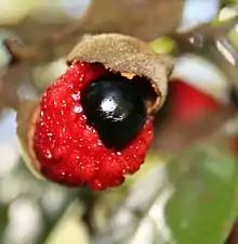 Соцветия внепазушные, длиной 90-120 мм, представляют собой маловетвящиеся метёлки. Цветение длится с октября по декабрь. Цветки двуполые или тычиночные (мужские). Лепестки отсутствуют. Тычинок в двуполых цветках — 5-8, в мужских — 6-10, тёмно-красного цвета. Плодоношение с ноября по август. Плод бесчерешковый, с 1-2 долями, длиной 14-20 мм, шириной 9-14 мм. Семя имеет размеры 7-10 × 4-8 мм, чёрное, блестящее, окружено ярко-красным мясистым образованием[2][5].