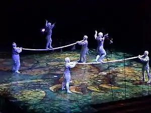 - Воздушные перекладины — группа акробатов летают и вращаются на перекладинах высоко над сценой