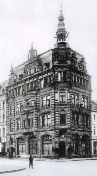 Здание было построено в 1882-1883 годах по проекту архитекторов Отто ван Эльса и Бруно Шмитца в стиле историзма, основанного на формах немецкого Северного Возрождения. На первом этаже размещалась торговая галерея, а выше — жилые этажи. Здание принадлежало вдове Шмиц-Лендерс, занимавшейся торговлей бельём, льняными изделиями и модными товарами.[1].