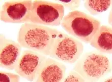 Готовят временные давленые препараты корневых меристем. Для этого от окрашенного корешка лезвием отрезают кончик меристемы длинной 2-3 мм (кончик отличается по более тёмной окраске и утолщением), помещают на предметное стекло в каплю 45 % уксусной кислоты, накрывают покровным стеклом и с помощью спички аккуратно раздавливают до получения монослоя клеток. Препараты анализируют под микроскопом при увеличении 12,5×1,5×40. На препаратах рассматривают мелкие, округло-квадратной формы клетки с хорошо прокрашенными ядрами и неповреждёнными клеточными стенками.[63]