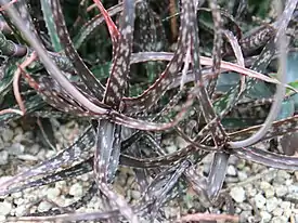 Побеги до 20 см высотой, полегающие, обильно разветвлённые от основания. Листья 5-10 см длиной, узкие, менее 1 см в ширину, сочные, жёсткие, изогнутые, в той или иной степени коричнево-зелёные с розово-коричневыми полосами. Часто имеют пятна на внешней поверхности. По краям вооружённые мягкими белыми шипами 1 мм длиной, расположенными на расстоянии 1-2 мм друг от друга. Цветки трубчатые, 3-4 см длиной, оранжевого или жёлтого цвета, у основания красные, расположены в кистях на длинном одиночном цветоносе.