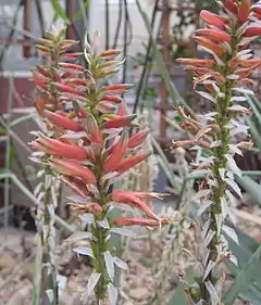 Яйцевидные, сужающиеся прицветники имеют длину от 10 до 15 миллиметров и 6 миллиметров в ширину. Красные или желтые цветы от 5 до 10 мм в длину ножек. Цветки длиной около 30 мм и закругленные на своей базе. На уровне яичника, цветы диаметром до 8 мм. Кроме того, они немного сужаются, а затем легко расширены до устья. Снаружи лепестки не слиты вместе на длине от 10 до 16 мм. Тычинки и пестик выступают от 2 до 3 мм вне цветка.