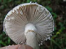 Пластинки частые, свободные или узко-приросшие к ножке, белого или кремового цвета, имеются также пластиночки[3].