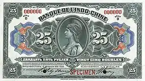 Россия (1919): 25-рублёвая банкнота Индо-Китайского банка, планировались к выпуску во Владивостоке, в обращение не поступили