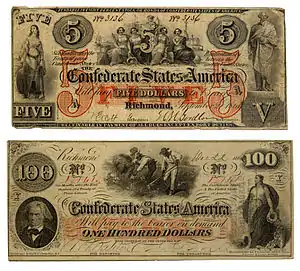 Купюры 5 и 100 долларов Конфедеративных Штатов Америки (1861—1862)