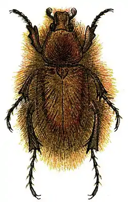 Бока среднегруди сверху не видны. Передние голени с двумя-тремя простыми зубцами. Задние бёдра самцов не утолщены. Тело мохнатое, особенно голова, переднеспинка и нижняя часть тела[1].