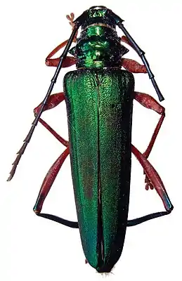 Довольно крупные, продолговатые, блестящие жуки металлического цвета, ноги часто красноватые. Усики тонкие и примерно равны длине тела насекомого. Голова слегка удлиненной формы. Переднеспинка округло-шестиугольной формы с тупыми зубцами с каждой стороны. Ноги тонкие, задние довольно длинные.