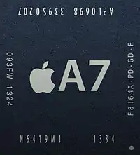 Apple A7 — 64-битный 2-ядерный ARM-микропроцессор компании Apple из серии Apple Ax. Микроархитектура Cyclone[5]. Использует набор инструкций ARMv8. Содержит 1 миллиард транзисторов на площади в 125 кв. мм.