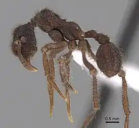 Мелкие муравьи коричневого цвета. Глаза относительно большие и выпуклые (более девяти омматидиев по самой короткой оси); лобные доли при виде анфас субквадратные, передний край наличника вогнутый, без блестящей кутикулярной полосы; шея относительно длинная и широкая, без срединного киля; плечевой выступ на виде сверху в виде угловатой доли; вентральный мезоплевральный киль при виде сбоку тонкий; и петиоль при виде сбоку треугольный, с передне- и постеродорсальным профилями почти одинаковой длины. Усики рабочих и самок 11-члениковые, у самцов состоят из 12 сегментов. Нижнечелюстные щупики 3-члениковые, нижнегубные щупики состоят из двух сегментов (формула щупиков 3,2). Стебелёк между грудкой и брюшком состоит из двух члеников: петиоля и постпетиоля (последний отделён от брюшка), жало развито, куколки голые (без кокона). Петиоль вытянутый, без явного узелка[1][2].