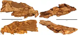 Ростральная кость и костяная сердцевина клюва загнуты вниз и имеют арочный киль на вершине с бугром спереди, на котором, вероятно, располагался рог. Перед передним зубцом край верхней челюсти над его общей длиной вогнутый вид сбоку. Предглазничное отверстие в два раза длиннее своей высоты, и имеет заострённую заднюю часть, расположенную под глазницей[4].