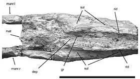 Верхняя поверхность симфиза ограничена тупыми внешними краями (в отличие от острых краёв Thalassodromeus[5][6]), разделёнными узкой впадиной. Эта впадина становится вогнутой в задней части челюсти, и она окружена парой хорошо развитых гребней, отставленных от фактических внешних краёв, что необычно, поскольку у прочих известных представителей группы этого не наблюдается. Гребни отделены от внешних краёв узкими углублениями. Большинство других беззубых птерозавров имеют простую уплощённую или вогнутую поверхность. В задней части симфиза имеется неглубокая ямка, которая заканчивается двумя сегментами, как у Caupedactylus и Quetzalcoatlus[1][4].