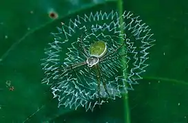 Паутина имеет утолщённое зигзагообразное плетение из многих нитей у центра — стабилимент[5]. Таких утолщений, которые отходят от центра может быть два, три, четыре или более, что является видовым признаком. Стабилимент может быть вертикальным, с круговым плетением у центра паутины, в виде Х-образного креста. Его значение не ясно, несмотря на многочисленные исследования. Основные гипотезы: отпугивание хищников[6], привлечение насекомых[7], маскировка паука и тому подобное.