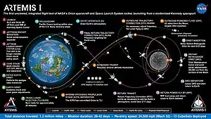 В ходе миссии планируется первый запуск ракеты SLS версии Block 1, которая будет состоять из пятисегментных твёрдотопливных ракетных ускорителей, четырёх жидкостных ракетных двигателей RS-25D и второй ступени на криогенном топливе[9]. Целью миссии Artemis 1 является демонстрация работы интегрированных систем, а также тестирование системы тепловой защиты «Ориона» при вхождении в плотные слои атмосферы на высокой скорости (11 км/сек)[9].
