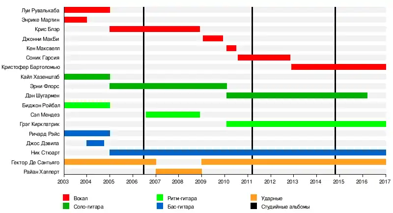 - Кайл Хазенштаб — соло-гитара (2003–2005)