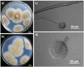 Конидии шаровидные или почти шаровидные, 4—5 мкм в диаметре, с морщинисто-бородавчатой поверхностью. Апикальное вздутие конидиеносца 45—69 мкм в диаметре, головки двухъярусные.