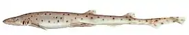 Окрас бледный с редкими, ярко выраженными коричневыми пятнами. Голова и рыло довольно вытянутые. Тонкий хвостовой стебель. Спинные и брюшные плавники небольшие. Основание анальных плавников равно или меньше расстоянию между анальными и брюшными плавниками. Края зубов зазубрены, зубы имеют 5 заострённых кончиков[1].