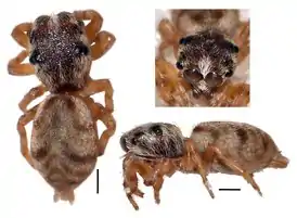 - Galiano M.E. 1987c. Revision de los genros del grupo Hurieae (Araneae, Salticidae). J. Arachnology, 15: 290, figs 1, 16-17. With Author’s and Editor’s permission.