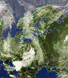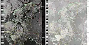 При постобработке возможно окрашивание снимка на основании относительной разницы в уровнях по спектральным каналам (которая отличается для разных типов поверхности), а также, за счёт знания положения спутника в конкретный момент времени, наложение координатной сетки, линий побережий, границ государств и прочих ориентиров.