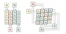 Первые четыре блока G0,…,G3 могут вычисляться параллельно, так как каждый изменяет свою определённую колонку переменных матрицы состояний. Назовём процедуру вычисления G0,…,G3 column step. Точно также могут быть параллельно вычислены G4,…,G7, но они в свою очередь изменяют каждый свою диагональ матрицы состояния v. Поэтому назовём процедуру вычисления G4,…,G7 diagonal step. Возможность параллельного вычисления Gi представлена графически.