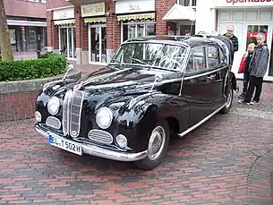 Тем не менее в Мюнхене подумывали о возобновлении автомобильного производства. В 1949 году был создан прототип автомобиля BMW 501 дизайн для которого разработало итальянское ателье Pininfarina. Тем не менее, этот прототип не был принят, а вместо него началась разработка автомобиля с использованием предвоенных заделов компании. BMW представила 501-ю модель в 1951 году на выставке IAA во Франкфурте. Автомобиль был запущен в серию лишь в 1952 году. Изначально на него устанавливался слабый для тяжёлого автомобиля рядный шестицилиндровый двигатель объёмом 1971 см³, развивавший всего 65 л.с. и разгонявший автомобиль до 135 км/ч, что не позволяло на равных соревноваться с новейшими моделями Mercedes-Benz. В остальном, автомобиль был достаточно современен — на нём были применены гнутые стекла, детали из лёгких сплавов и другие технические новшества. Однако, дизайн автомобиля был достаточно консервативным — полупонтонные кузова с плавным переходом от передних крыльев к задним в те годы активно вытеснялись полностью понтонными (как у «Победы»). В отличие от EMW, мюнхенские BMW сохранили фирменную решётку радиатора с двумя вертикальными «ноздрями». Дизайн автомобиля был весьма самобытным и красивым, у себя на родине эти машины получили прозвище «Ангел Барокко» (нем. «Barockengel»). Кузов для новой модели производили в штутгартской фирме Baur.