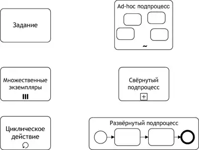 - изображаются прямоугольниками со скругленными углами. Среди действий различают задания и подпроцессы. Графическое изображение свёрнутого подпроцесса снабжено знаком плюс у нижней границы прямоугольника.
