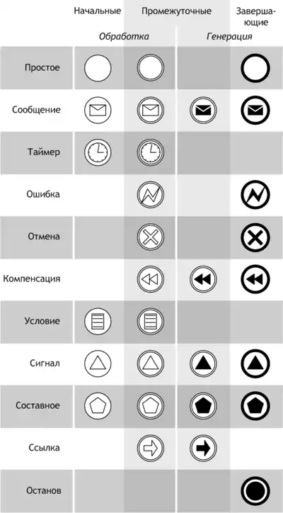 - изображаются окружностью и означают какое-либо происшествие в мире. События инициируют действия или являются их результатами. Согласно расположению в процессе события могут быть классифицированы на начальные (англ. start), промежуточные (intermediate) и завершающие (end). Начиная с BPMN 1.1 различают события обработки и генерации. Ниже представлена категоризация событий по типам.
