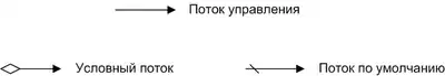 - Изображается сплошной линией, оканчивающейся закрашенной стрелкой. Поток управления задаёт порядок выполнения действий. Если линия потока управления перечеркнута диагональной чертой со стороны узла, из которого она исходит, то она обозначает поток, выполняемый по умолчанию.