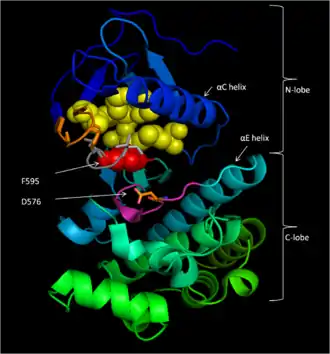Мотив DFG включает остатки D594, F595 и G596 и является критическим мотивом B-Raf для функционирования белка как в неактивном, так и в активном состоянии. В неактивной конформации белка F595 занимает нуклеотид-связывающий пакет и предотвращает вход АТФ в пакет, снижая вероятность катализа[8][13][14]. В активной конформации D594 связывает двухвалентный катион марганца, что стабилизирует β- и γ-фосфатные группы АТФ и ориентируя γ-фосфат для переноса на субстрат[11].