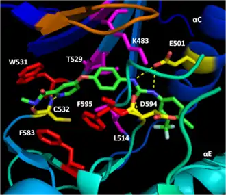 Дистальная пиридиновая группа ингибитора заякоривается в гидрофобном нуклеотид-связывающем кармане N-доли киназного домена, взаимодействуя с белковыми остатками триптофана W531 и фенилаланинов F583 и F595. Гидрофобные связи ингибитора с F583 каталитического центра фермента и F595 мотива DFG стабилизирует неактивную конформацию этих участков, снижая вероятность активации фермента. Последующие гидрофобные взаимодействия центрального фенильного кольца ингибитора с остатками K483, L514 и T529 фермента ещё более увеличивают аффинность ингибитора к киназному домену фермента. Гидрофобное взаимодействие остатка F595 с ингибитором также энергетически ещё больше снижает вероятность конформационного перехода DFG. Наконец, полярные взаимодействия ингибитора с киназным доменом далее повышают аффинность связывания ингибитора с ферментом и ещё более стабилизируют мотив DFG в его неактивном состоянии. Остатки E501 и C532 связываются водородными связями с остатком мочевины и пиридина в молекуле ингибитора, соответственно. Карбонильная группа остатка мочевины в молекуле ингибитора связывается водородной связью с азотом амида в остатке D594, что в результате полностью запирает мотив DFG[12].