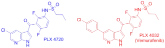 PLX4032 (Вемурафениб) - ингибитор мутантной формы B-Raf V600E, одобренным FDA для лечения поздних стадий меланомы[8]. В отличие от сорафениба (BAY43-9006), который ингибирует неактивную форму киназы, вемурафениб ингибирует активную форму фермента на стадии активированного мотива DFG[13][14], прочно заякориваясь на АТФ-связывающем участке. Ингибируя только активную форму киназы, вемурафениб селективно ингибирует пролиферацию только клеток с нерегулируемой формой киназы B-Raf, которая приводит к образованию раковой опухоли.