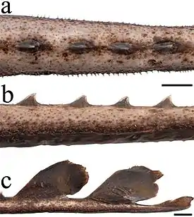 Широкие и плоские грудные плавники этих скатов образуют ромбический диск с широким и вытянутым треугольным рылом и закруглёнными краями. Рыла имеет тонкий поддерживающий каркас из гибкой хрящевой ткани. Передние края диска прямые. На вентральной стороне диска расположены 5 жаберных щелей, ноздри и рот. Диаметр глаз в 6 раз меньше расстояние от кончика рыла до глаз и в 0,73 раза меньше межглазного расстояния. Длина довольно широкого рта составляет 6,8 % длины тела. Тонкий хвост средней длины немного приплюснут. На хвосте имеются латеральные складки. У этих скатов 2 редуцированных спинных плавника и редуцированный хвостовой плавник[1]. Дорсальная поверхность диска полностью покрыта мелкими тонкими шипиками. Кожа брюшной поверхности голая. Крупные колючки на диске отсутствуют. На хвосте имеется ряд из 18 крупных колючек, сжатых в боковой проекции. Диск окрашен в белый цвет за исключением чёрной окантовки. На верхней челюсти имеется 30, а на нижней 28 зубных рядов. Грудные плавники сформированы 88 лучами[3].