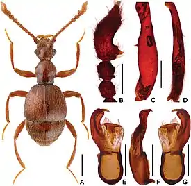 Мелкие коротконадкрылые жуки. Длина тела 2,52 мм, длина головы 0,51 мм. Основная окраска красновато-коричневая. Антенномер XI сильно вогнутый у вентрального края и с острым базальным вступом. Усики 11-члениковые, брюшко из 5 видимых тергитов. Вертлуги короткие, ноги прилегают к тазикам. Надкрылья в базальной части с 3 ямками. Мирмекофилы, ассоциированы с муравьями Ectomomyrmex[1].