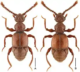 Мелкие коротконадкрылые жуки. Длина тела 2,8 мм, длина головы 0,5 мм. Основная окраска красновато-коричневая. Усики четковидные, антенномер XI с апикальным зубчиком. Глаза из 50 фасеток. Усики 11-члениковые, брюшко из 5 видимых тергитов. Вертлуги короткие, ноги прилегают к тазикам. Надкрылья в базальной части с 3 ямками. Мирмекофилы, ассоциированы с муравьями Lasius[1].