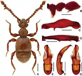 Мелкие коротконадкрылые жуки. Длина тела 2,8 мм, длина головы 0,6 мм. Основная окраска красновато-коричневая. Усики четковидные, антенномер XI с продольным выступом у середины. Глаза из 60 фасеток. Усики 11-члениковые, брюшко из 5 видимых тергитов. Вертлуги короткие, ноги прилегают к тазикам. Надкрылья в базальной части с 3 ямками. Собран в лесной подстилке[1].