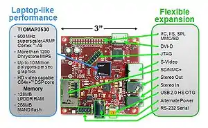 Размер платы составляет примерно 3.0 х 3.0". Центральный процессор платы, OMAP3530, основан на ядре ARM Cortex-A8 и включает в себя цифровой сигнальный процессор TMS320C64x+ (ускорение обработки видео- и аудиоданных) и PowerVR SGX530 (ускоритель 2D/3D графики, поддерживает OpenGL ES 2.0).