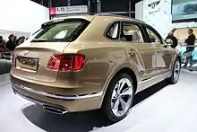 Bentley Bentayga (рус. Бентейга[2]) — среднеразмерный кроссовер сегмента «суперлюкс», выпускающийся британской компанией Bentley Motors с 2015 года. Это первый кроссовер компании, он планировался ещё с 2012 года и представляет собой эволюцию концепт-кара EXP 9 °F. Впервые был представлен на Франкфуртском автосалоне 2015 года[3]. Построен на платформе Volkswagen MLB, которая использовалась на втором поколении Audi Q7, третьем поколении Porsche Cayenne и Volkswagen Touareg, а также Lamborghini Urus, с которым Bentayga разделила около 20 % общих запчастей. Продажи начались в ноябре 2015 года. В России продажи начались в апреле 2016 года по цене около 17 млн рублей[4] или около 209 тысяч долларов, что делает его самым дорогим серийным кроссовером в мире[5].